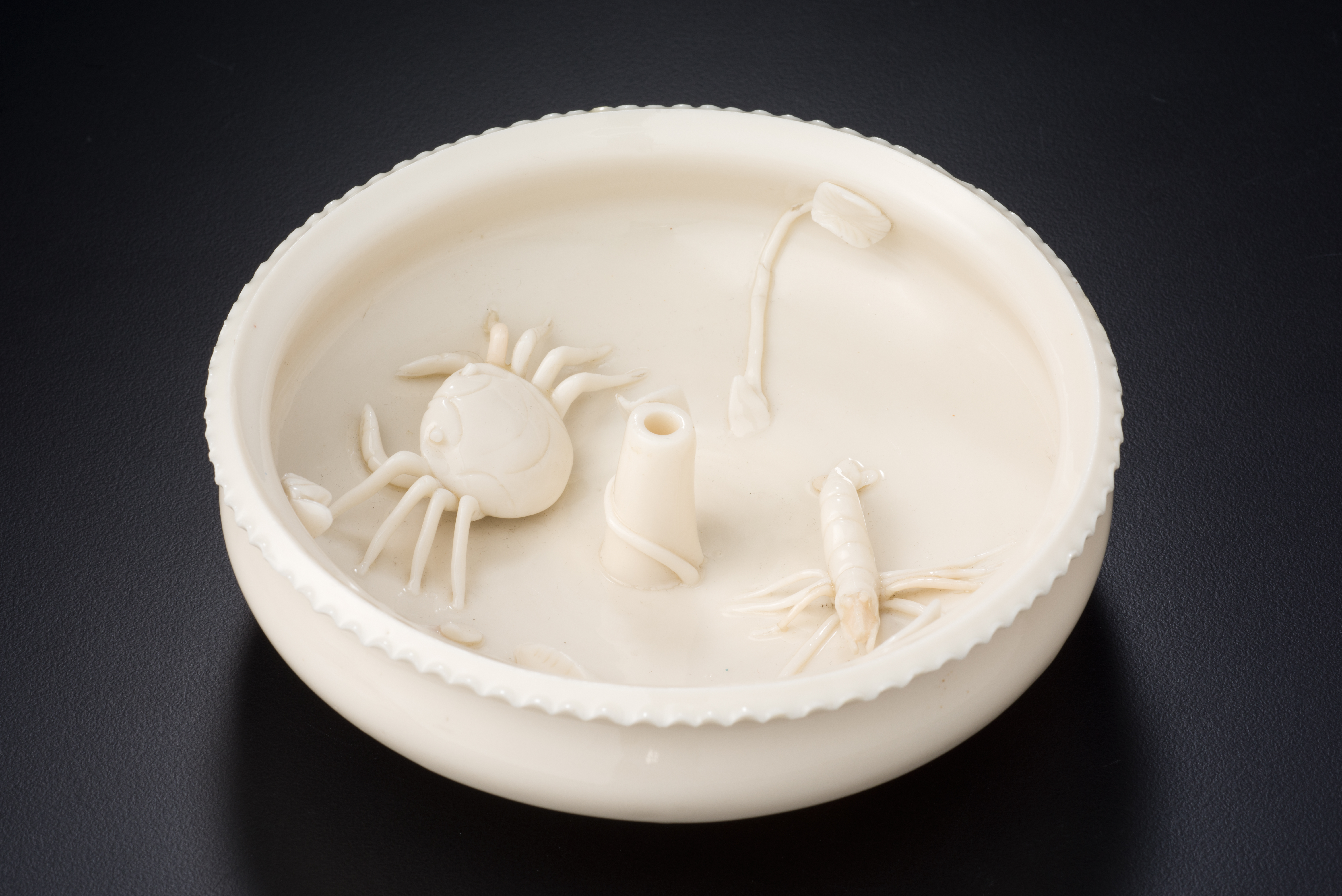 What sea creatures can you find in the basin of this lamp? In the past, a scholar may have placed this lamp on his desk. He would fill it with oil and put a wick in the centre. When the wick was lit, the flickering light over the pool of oil would have made the crab and shrimp appear to come alive "underwater".