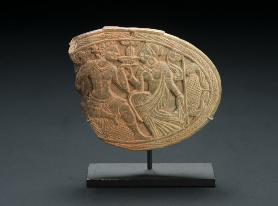 This is the lid of an oval-shaped stone box that was made over 1,600 years ago! The picture carved on it shows a couple holding a cup, from which they sip a drink together. What do you think they are drinking? We think that it’s likely they were drinking wine, as there is a grape vine hanging right above the cup.