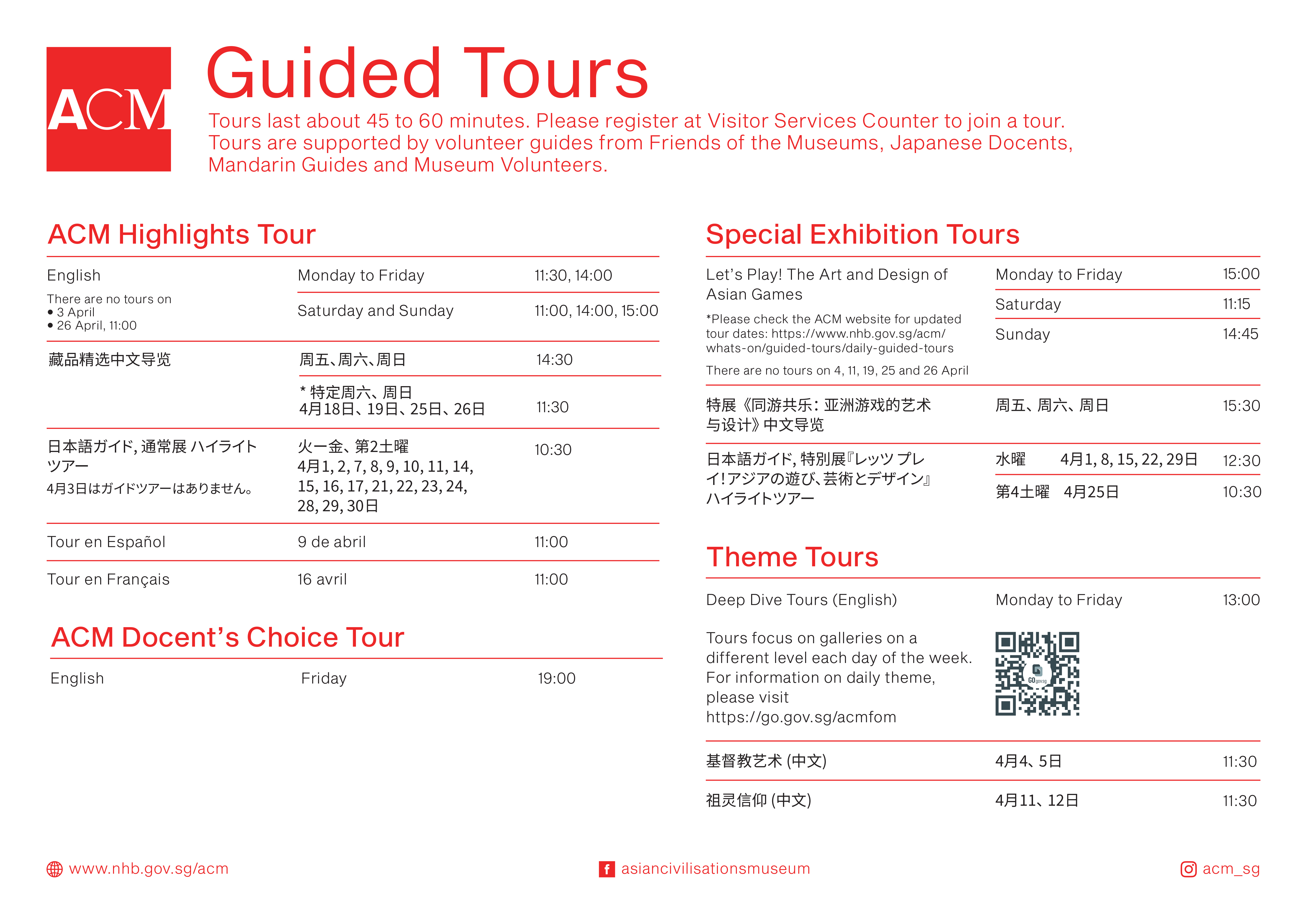 Tour schedule is subject to change. Please call the Visitor Services Counter at 6332 7798 if you want to make sure there will be a tour on the day you are coming to the museum.